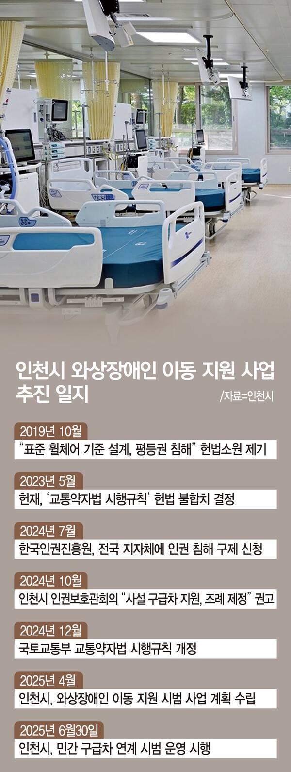 평등권 침해 문제로 헌법소원까지 제기된 와상장애인 이동권 보장이 법령 개정을 거쳐 인천에서 제도적 결실을 이룬다. 특수차량이 상용화하기 전까지 인천시가 민간 구급차를 활용해 와상장애인 의료 접근권 사각지대를 해소하는 이동 지원에 나선다.