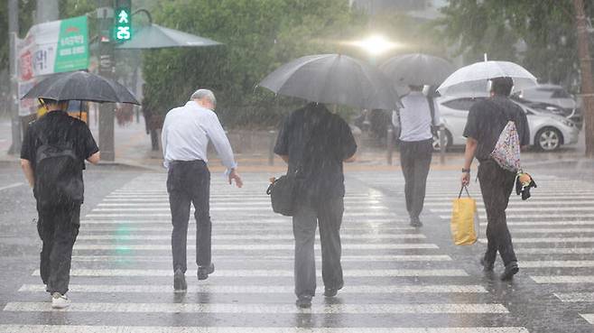 ▲ 서울 서남권에 호우주의보가 발효된 8일 서울 영등포구 여의도 국회 인근에서 시민들이 우산을 쓰고 이동하고 있다.