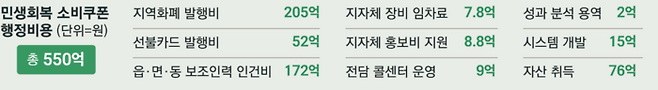 행정비용 550억원 중 비중이 가장 큰 건 지역화폐 발행비용과 인건비다. 행정안전부는 각각 205억원과 172억원이 필요할 것으로 계산해 추경에 반영했다.