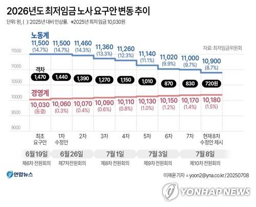 [그래픽] 2026년도 최저임금 노사 요구안 변동 추이