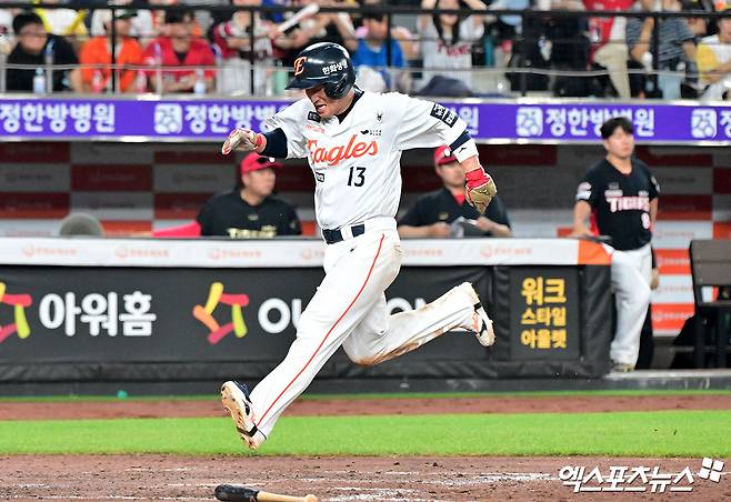 (엑스포츠뉴스 대전, 김한준 기자) 8일 오후 대전 한화생명 볼파크에서 열린 '2025 신한 SOL Bank KBO리그' KIA 타이거즈와 한화 이글스의 경기, 5회말 2사 1,2루 한화 최재훈이 리베라토의 1타점 적시타때 득점에 성공하고 있다.