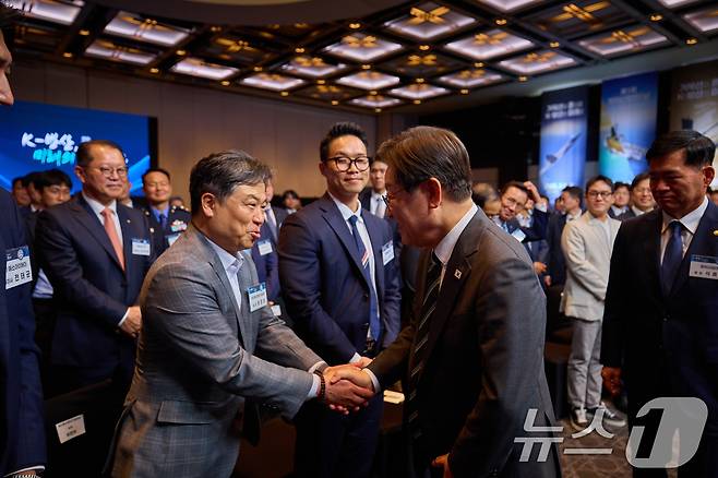 (서울=뉴스1) 허경 기자 = 이재명 대통령이 8일 서울 용산구 그랜드 하얏트 호텔에서 열린 제1회 방위산업의 날 토론회에서 참석자들과 인사하고 있다. (대통령실 제공. 재판매 및 DB 금지) 2025.7.8/뉴스1