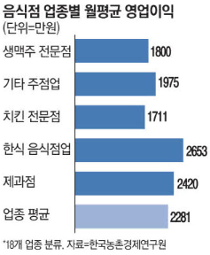 유흥주점이라는 특수성을 제외해도 생맥주 전문점(1800만2000원), 기타 주점업(1975만3000원) 등 술을 주요 품목으로 하는 업종 전반이 하위권에 속했다.