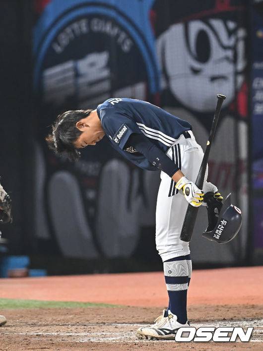 두산 베어스 김민석이 7회초 2사 2루 대타로 나와 타석에서 롯데 팬들에게 인사를 하고 있다. 2025.07.08 / foto0307@osen.co.kr