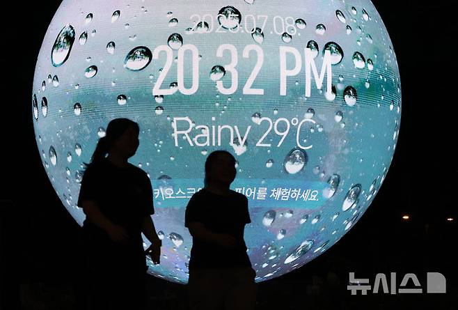 [서울=뉴시스] 황준선 기자 = 서울에 연일 열대야 현상이 지속되고 있는 8일 밤 서울 송파구의 한 조형물에 현재 기온이 표출되고 있다. 2025.07.08. hwang@newsis.com