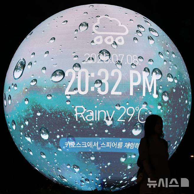 [서울=뉴시스] 황준선 기자 = 서울에 연일 열대야 현상이 지속되고 있는 8일 밤 서울 송파구의 한 조형물에 현재 기온이 표출되고 있다. 2025.07.08. hwang@newsis.com