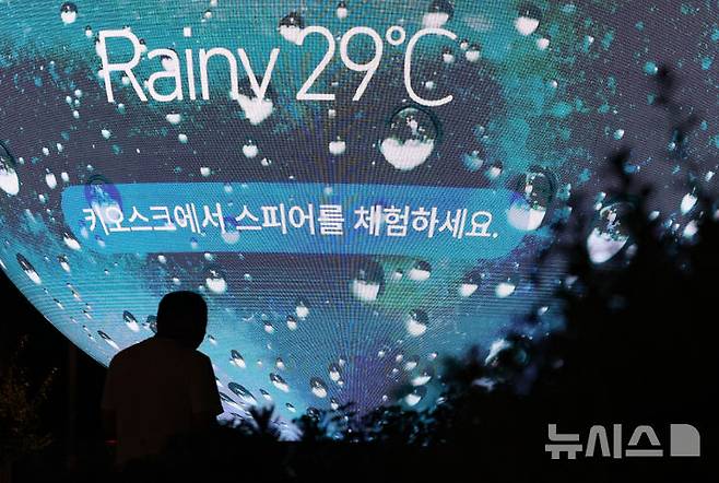 [서울=뉴시스] 황준선 기자 = 서울에 연일 열대야 현상이 지속되고 있는 8일 밤 서울 송파구의 한 조형물에 현재 기온이 표출되고 있다. 2025.07.08. hwang@newsis.com
