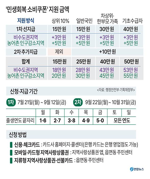 민생회복 소비 쿠폰과 관련해 당초 정부는 소득 수준과 지역 특성을 반영해 전 국민에 15만~52만원을 지급할 계획이었으나 여당의 증액 요구가 받아들여지면서 비수도권 지역과 인구감소 지역에 지급되는 금액이 늘었다.