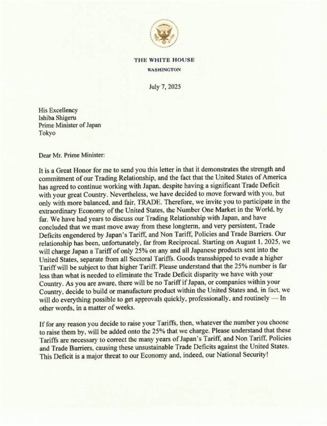 트럼프 대통령은 7일(현지시간) 이재명 대통령을 수신자로 지정한 서한에서 “8월 1일부터 우리는 미국으로 보낸 모든 한국산 제품에 25%의 관세를 부과할 것이며 이 관세는 모든 품목별 관세와 별도”라고 밝혔다.