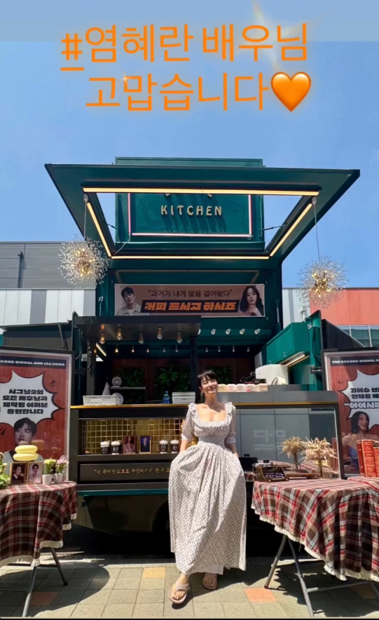두 번째 컷에서는 김혜수가 커피차 전체를 배경으로 원피스 자락을 살짝 쥔 채 환하게 웃고 있었다. 햇빛을 그대로 머금은 모습이었다. 소녀처럼 가볍고, 배우처럼 단단했다.