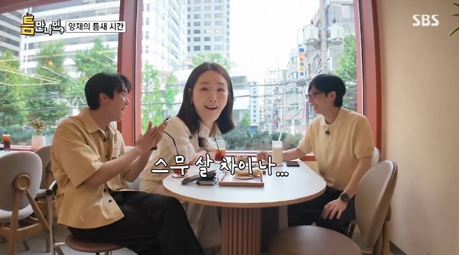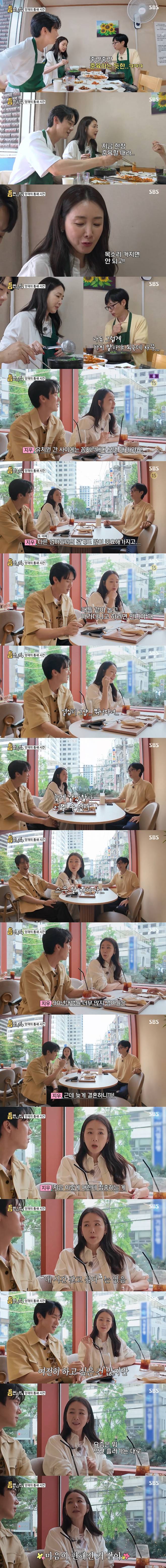 최지우는 "늦게 낳아서 어쩔 수 없다. 너무 힘들지만 다른 엄마들 열심히 쫓아다닌다"면서 "스무살 차이가 난다. 90년대 생들 엄마들 너무 많다. '같이 하실래요?' 하면 '네. 고맙습니다'라며 열심히 따라다닌다"며 웃었다.