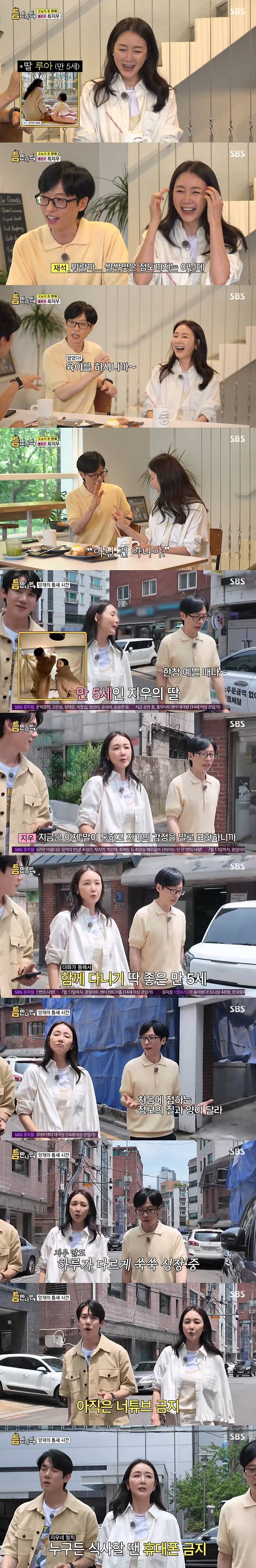 이를 들은 유재석은 "'인류가 진화하는구나'를 아이를 키우면서 느낀다. 처음에 접하는 정보의 질과 양이 다르다"고 하자, 최지우는 "맞다. 아이들이 말도 빠르다"고 했다. 최지우는 "아직 유튜브는 안 보여준다. 영상 안 보여주고 있다"며 "집 룰이 밥 먹을 때는 엄마, 아빠도 휴대폰을 금지한다"며 자신만의 육아법도 공개했다.