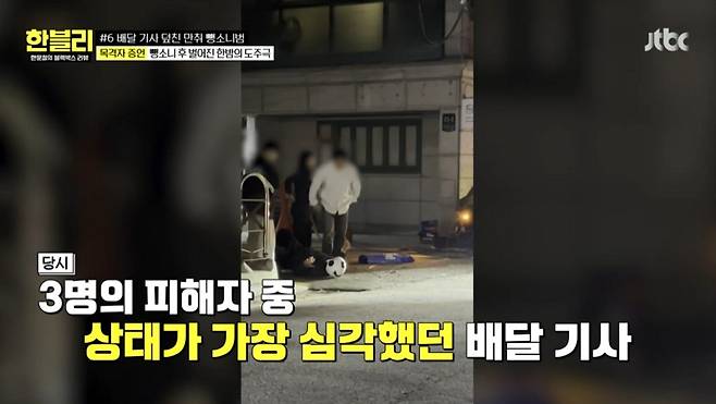 스튜디오에선 사고 당시 폐쇄회로(CC) TV 영상이 공개됐다. 영상에서 골목길을 빠르게 달리던 차량은 음식을 픽업 중이던 배달 기사 A씨를 비롯해 3명을 그대로 들이받았다. 사고 차량 운전대를 잡았던 가해자는 비틀거리면서 나와 잠시 현장을 살펴보더니 그대로 달아났다.