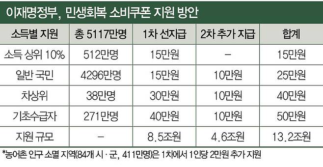 차상위계층과 기초생활수급자가 아닌 국민은 1차 15만원 + 2차 10만원을 받게 된다. 여기에 더해 거주 지역에 따라 쿠폰을 조금 더 받을 가능성도 있다. 소멸 위험 농어촌 지역 거주자 411만명에게는 1차 선지급 때 1인당 2만원을 추가 지급한다. 소득 수준과는 무관한 일괄 지급이다. 예를 들어 소멸 위험 지역에 거주하는 고액 자산가는 17만원을 받는다.