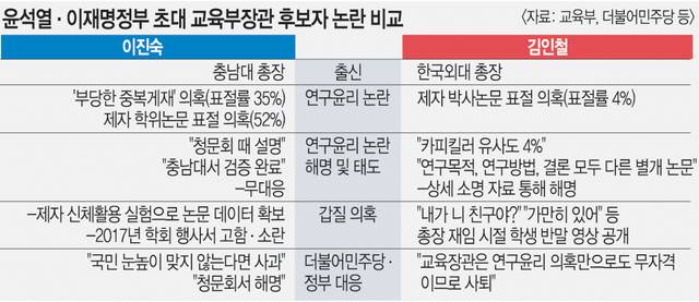 김 전 총장과 교육부는 두 논문 표절률이 4%에 불과하고 연구목적, 연구방법, 결론 등이 다른 별개 논문이라고 해명했다. 그럼에도 민주당은 연구윤리 논란이 불거진 것만으로 교육부 장관 자질이 없다고 주장했다. 교육부 장관은 학술 전반을 관장하므로 연구윤리에 대한 엄격한 기준을 적용해야 한다는 논리였다.
