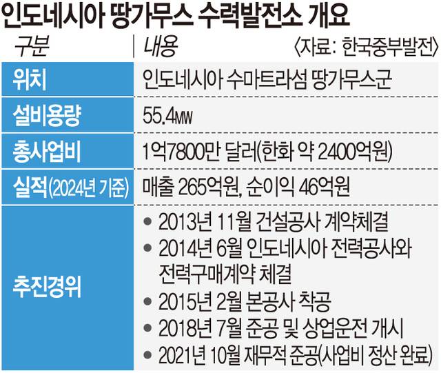 땅가무스 수력발전소의 연간 매출은 평균 300억원에 이른다. 중부발전은 지난 2015년 인도네시아 전력청과 1㎾h당 9센트로 30년간 전력구매계약(PPA)을 체결했다. 우기·건기 등 계절 변화나 전력 수급 상황에 무관하게 2045년까지 안정적인 수익을 확보할 수 있는 구조다. 2018년 상업운전을 시작한 이후 현재까지 투자금 회수율이 71%에 달한다. 현 추세대로라면 2년 내 투자금을 모두 회수할 것으로 전망된다.