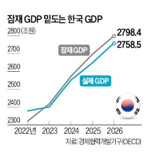 GDP 갭률은 잠재 GDP와 비교해 현시점의 실질 GDP가 어느 정도 수준인지를 나타내는 지표다. GDP에서 잠재 GDP를 뺀 격차를 잠재 GDP로 나눈 백분율 값이다. OECD는 올해 한국의 잠재 GDP 수준을 2695조2573억원으로 추정했다. 반면 실제 GDP 수준은 이보다 적은 2647조3804억원에 그칠 것으로 전망했다.