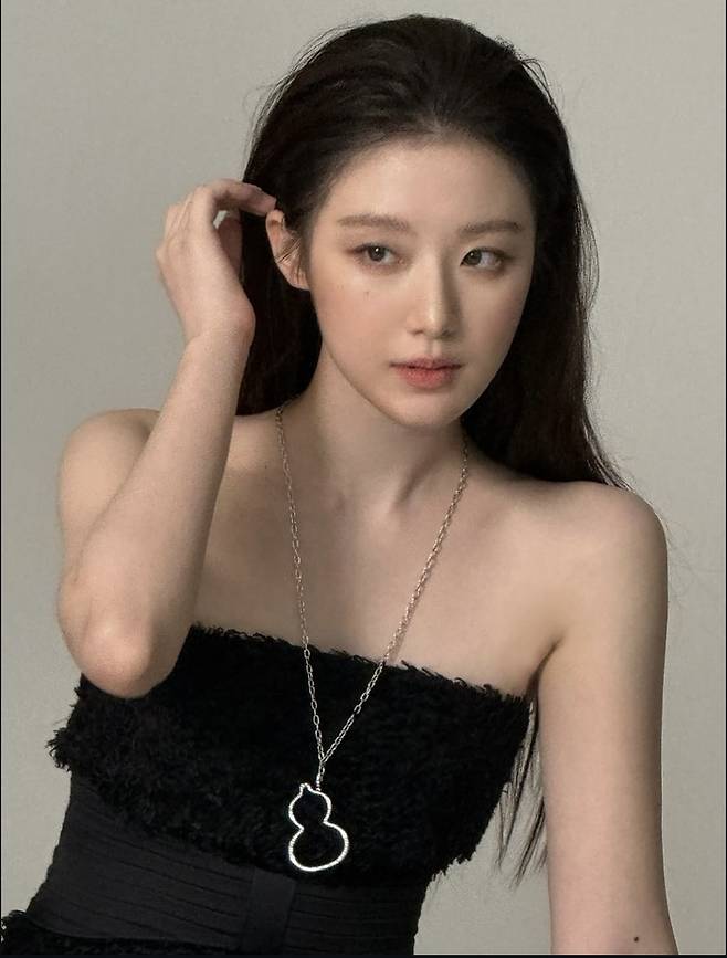 다른 사진에서 슈화는 깃털 같은 질감의 오프 숄더 블랙 드레스를 입고 눈부신 자태를 뽐냈다. 블랙 드레스에 포인트로 목에 건 은색 체인 목걸이는 우아한 느낌을 더했다.