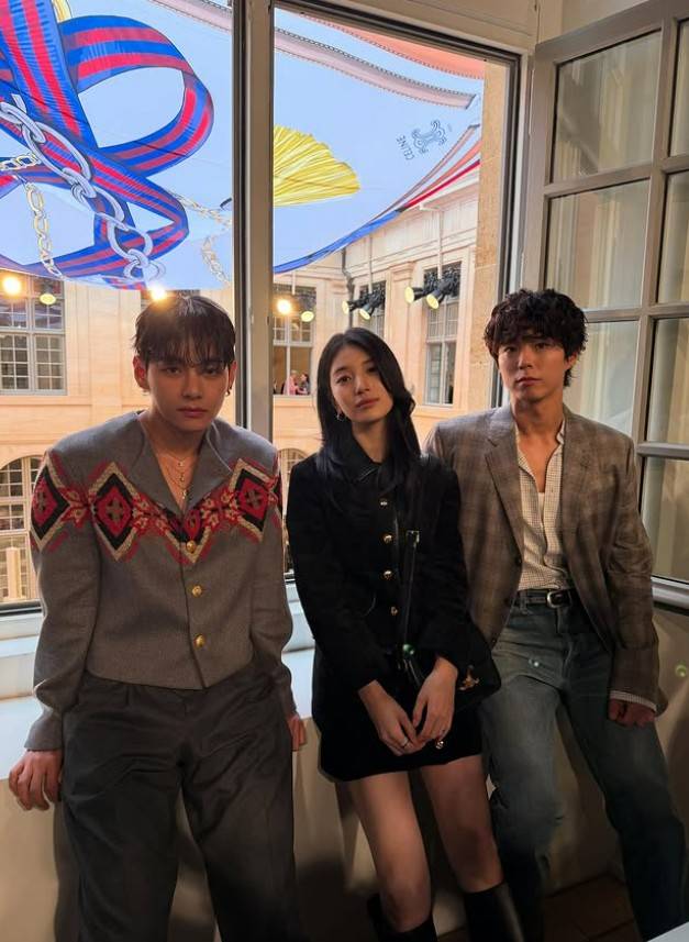 이날 창가에서 브랜드 셀린느의 글로벌 엠버서더로 함께 활동하는 수지, 박보검과 찍은 사진에서는 각기 다른 패션 스타일이 조화를 이루며 파리 현장의 생동감을 전했다.