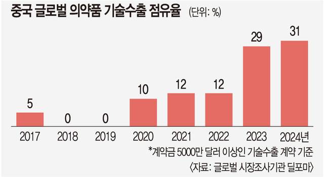 8일 글로벌 리서치 업체 딜포마에 따르면 지난해 전 세계 빅파마가 외부에서 들여온 신약 파이프라인의 31%가 중국 기업에서 나왔다. 2020년 10%, 2022년 12%에 그쳤던 중국 비중이 불과 2년 만에 세 배 가까이 치솟았다.
