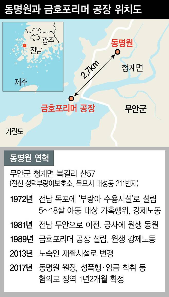진실화해위 조사 결과, 전남 목포시 대성동에 처음 터 잡은 사회복지법인 동명원은 경찰 출신 김춘식이 1972년 목포시로부터 인가를 받아 운영하기 시작했다. 1981년 전남 무안으로 완전히 이전했다. 이들이 동명원에 있었던 1980년대에는 만 5~18살 아동·청소년이 매 연말 기준 60~90명씩 수용돼 있었다. 무임 강제노동 현장은 동명원 원장 김춘식(1987년 사망)의 둘째 김두호가 1989년 동명원에서 서쪽으로 2.7㎞ 떨어진 청계면 해변에 설립한 금호포리머주식회사 공장이었다. 바닷가에서는 저 멀리 압해도, 가란도 등 신안의 섬들이 보였다. 이곳에서 노예 소년공 20여명이 일했다.