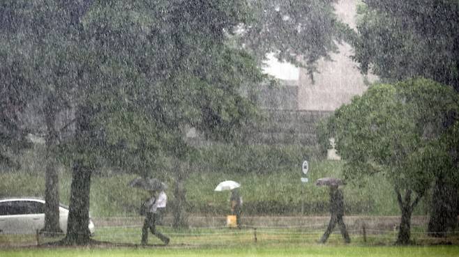 ▲ 서울 서남권에 호우주의보가 발효된 8일 서울 영등포구 여의도 국회에서 시민들이 우산을 쓰고 있다.