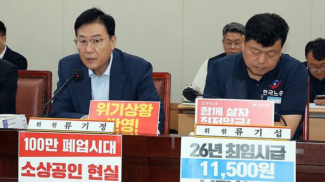 ▲ 최저임금위원회 사용자위원인 류기정 한국경영자총협회 전무가 8일 정부세종청사에서 열린 최저임금위원회 제10차 전원회의에서 발언하고 있다. 오른쪽은 근로자위원인 류기섭 한국노총 사무총장.