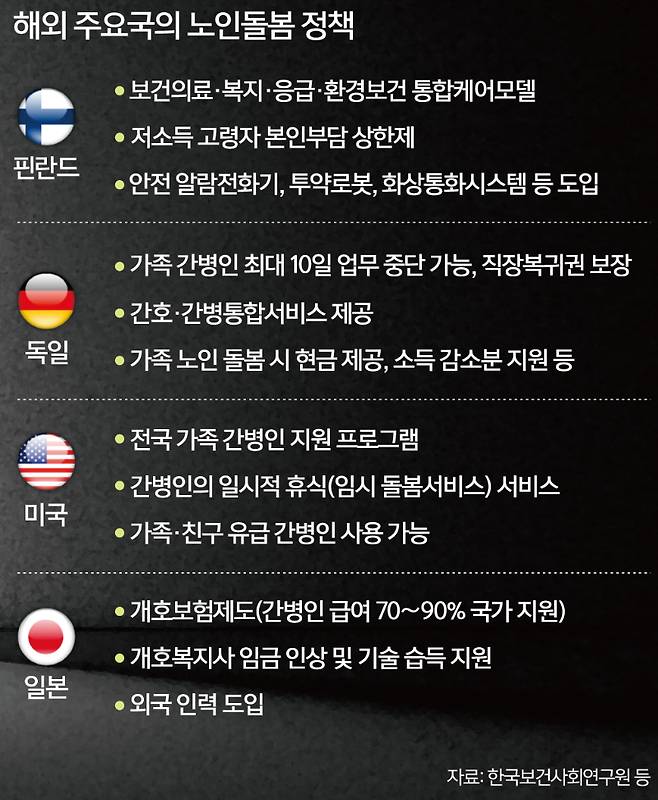 개인주의 성향이 강한 미국도 노인돌봄을 개인에게만 맡기지 않는다. ‘전국 가족 간병인 지원 프로그램’ 등을 통해 간병인의 부담을 덜고 가족이 오래 돌볼 수 있도록 돕는다. 공공의료보험 수급자라면 가족이나 친구가 유급 간병인이 될 수 있으며 일부 지역에서는 유급휴가도 가능하다.