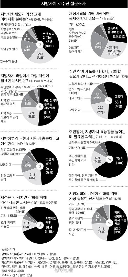 경향신문은 올해 지방자치 30주년을 맞아 지난달 12~25일 광역 자치단체 시도지사, 광역의회, 기초의회 등 133곳을 대상으로 설문조사를 실시했다.
