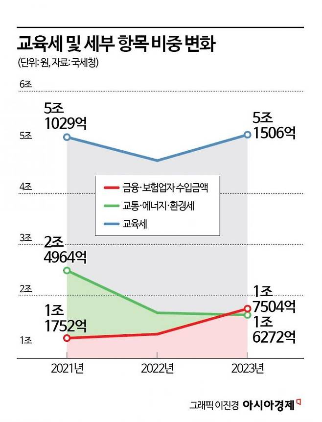 실제 금융·보험업자 수입액에서 걷는 교육세는 2015년(1조35억원) 1조원대로 접어들었고, 2020년부터는 4년 연속 증가했다. 2023년(1조7504억원)에는 교통·에너지·환경세(1조6272억원)를 처음 앞지르며 가장 큰 비중(33.98%)을 보였다. 2005년부터 2022년까지 비중이 가장 컸던 교통·에너지·환경세는 2021년(2조4964억원)까지 2조원대였지만 2022년(1조6692억원)부터 유류세 인하 조치로 1조원대를 유지 중이다. 금융·보험업 수익이 늘어나는 상황에서 유류세 인하까지 끝나면 교육세는 더 증가할 수 있다.