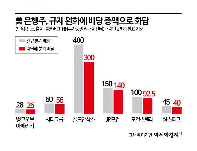 박경민 DB증권 연구원은 "이번 테스트에서 미국 은행들의 자본 적정성이 제고된 만큼 하반기까지 배당과 자사주 매입이 증가할 것"이라며 "트럼프 행정부가 추진하는 금융권 자본 규제 완화도 주주환원 확대에 기여할 수 있다"고 말했다. 현재까지 JP모건과 모건스탠리가 각각 500억달러, 200억달러 규모의 자사주 매입 프로그램을 승인했으며, 골드만삭스 역시 종전 주당 3달러 수준이었던 배당금을 4달러로 대폭 상향하는 등 금융 규제 완화 기조에 화답하고 있다.