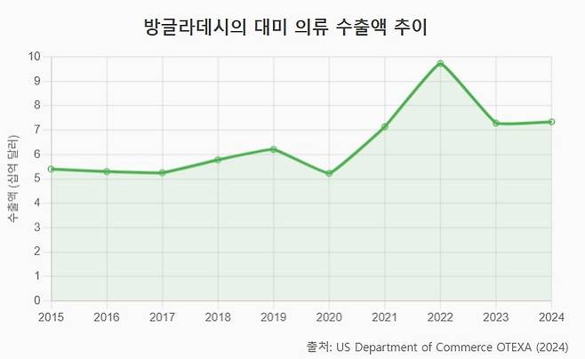 미국의 방글라데시에 대한 35% 관세 부과는 글로벌 의류 산업에 영향을 줄 전망이다. 방글라데시는 중국에 이어 세계 2위의 의류 수출국이다. 미국 섬유 의류 사무국(OTEXA)에 따르면 지난해 방글라데시의 미국으로의 의류 수출은 1년보다 0.75% 증가한 73.4억 달러로 집계됐다.