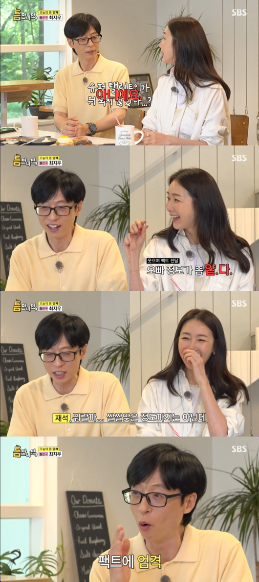 [OSEN=박근희 기자] '틈만 나면,’ 유재석이 오랜만에 재회한 배우 최지우에게 "쌀쌀맞진 않은데 엄격하다"는 솔직한 평가를 내렸다.