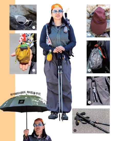 ❸ 주머니① 하이퍼라이트마운틴기어에서 만든 주머니. 다이니마 천으로 만들어져 방수 기능이 있다. 그녀는 이 주머니에 간식을 넣고 배낭 어깨끈에 매달아 산행 중 힘들 때마다 빠르게 꺼내어 먹는다.