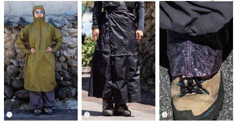 ❸ 방수용 게이터 방수재킷이나 치마에서 떨어지는 물방울이 등산화의 발등으로 떨어져 신발 내부가 젖는 것을 방지하는 목적이다. 게이터의 효과를 극대화하기 위해선 고어텍스 등산화를 신는 게 좋다.