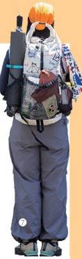 ❼ 김혜연의 뒷모습 그녀가 멘 배낭은 하이퍼라이트마운틴기어 제품이다. 이 배낭을 5년 정도 쓰고 있다. 다이니마 천으로 만들어졌고, 방수기능이 있다. 배낭 앞에 달린 주머니 용량이 꽤 커서 여기에 물통이나 옷, 그외 산행 중 재빨리 꺼내어 쓸 수 있는 것들을 보관한다. 그녀는 백패킹할 때 보통 에어매트를 쓰지만 이날은 발포매트를 챙겨 왔다. 에어매트는 누웠을 때 소음이 심하기 때문인데, 이 소리가 주변 탐방객들의 잠을 방해할 수 있기 때문이다.