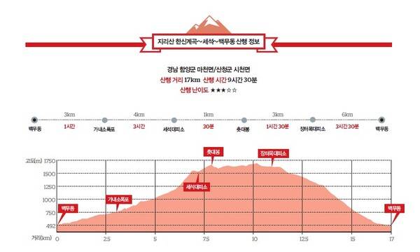 백무동탐방지원센터에서 오층폭포까지 이어진 길은 완만하다. 하지만 그 이후 세석대피소까지 1.3km가 가파른 돌계단으로 이뤄져있다. 이 구간만 잘 참고 넘기면 세석평전과 만난다. 세석대피소에서 장터목대피소까지 가는 길 또한 어렵지 않다. 촛대봉과 연하선경 등의 비경을 볼 수 있어 재미있기도 하다. 장터목대피소에서 백무동까지 길은 이전 코스에 비해 지루한 면이 있다. 초반엔 능선길이라 폭포 등은 볼 수 없다. 백무동 가까이에 이르러서야 계곡물 소리가 커지고 이름 없는 작은 폭포를 볼 수 있다.