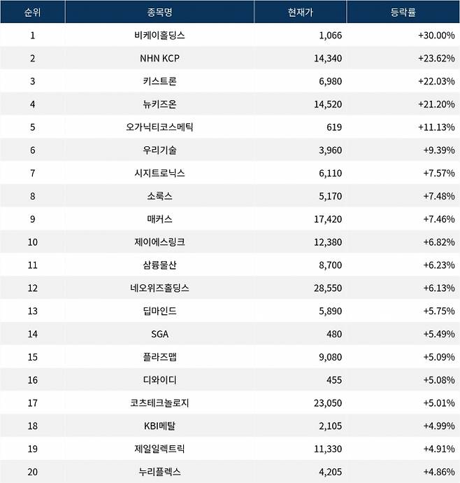 [서울데이터랩]비케이홀딩스 30% 상한가…실시간 상승률 1위