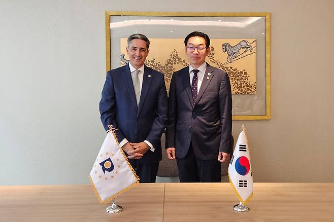 [서울=뉴시스] 김완기 특허청장이 8일 스위스 제네바에서 열린 제66차 세계지식재산기구총회에서 주앙 네그랑 유럽연합지식재산청 청장과 기념촬영을 하고 있다. (사진=특허청 제공) 2025.07.09. photo@newsis.com *재판매 및 DB 금지