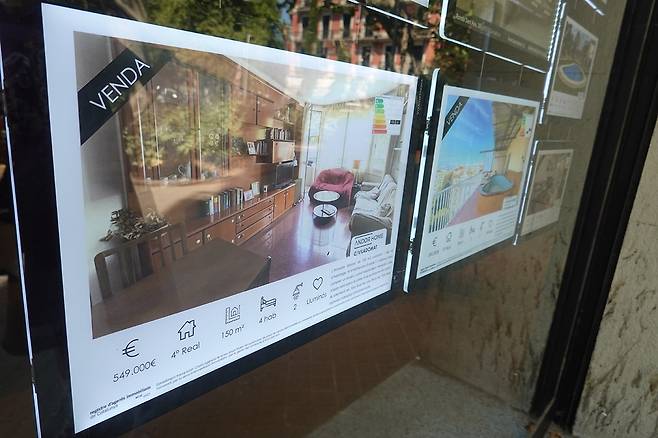 | ▲ 2025년 6월 30일(현지시간) 스페인 바르셀로나에 있는 한 부동산 사무실 외벽에 부동산 정보가 걸려있다. |