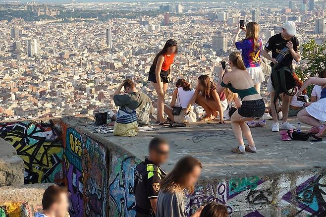 그녀 옆으로는 산 위에서 시내를 내려다볼 수 있는 카르멜 벙커(Bunkers del Carmel)에서 관광객들이 하산하고 있었다. 시가 문화재 보호와 소음 방지를 위해 2023년 5월부터 해당 시설 야간 출입을 제한했기 때문이다. 이날에도 저녁이 되자 현지 경찰이 벙커를 찾아 관광객을 내보냈다.