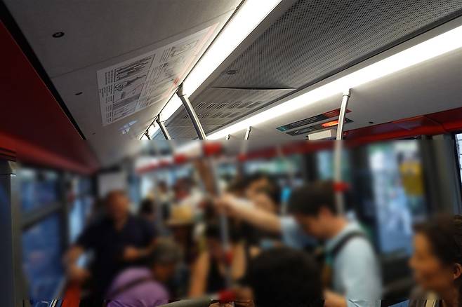 | ▲ 2025년 6월 30일 오후 8시 20분(현지시간) 스페인 바르셀로나 카르멜 벙커(Bunkers del Carmel)에서 카탈루냐 광장(Placa de Catalunya)으로 향하는 24번 버스 안에 사람이 가득 찼다. |