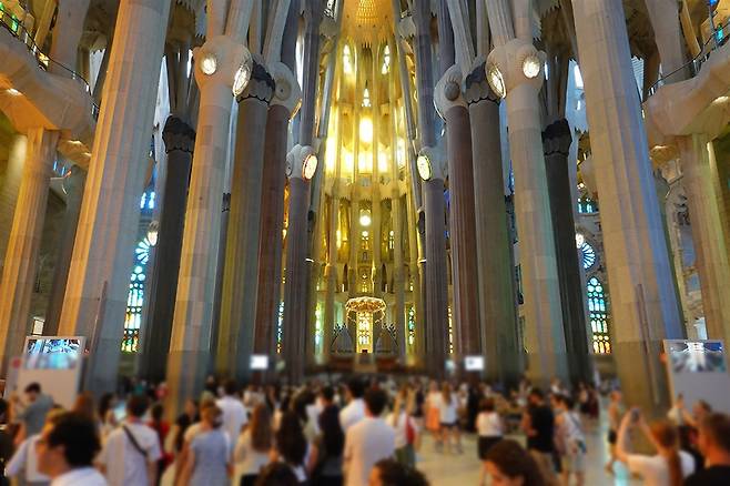 | ▲ 2025년 7월 1일(현지시간) 스페인 바르셀로나 성가정 성당(Sagrada Familia)에 관광객이 성당 내부를 구경하고 있다. |