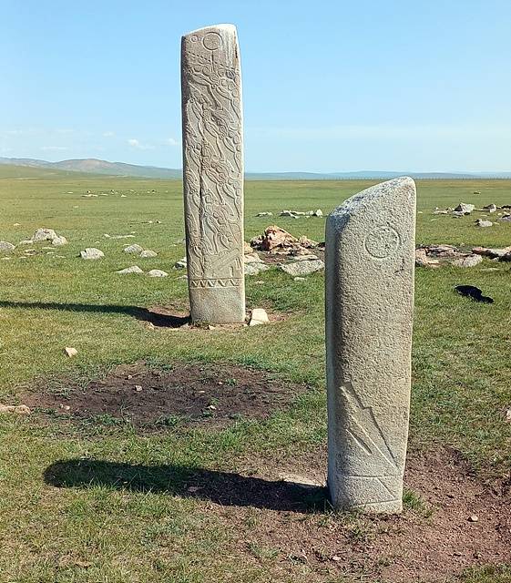 | ▲ 몽골 아르항가이 '하노이' 마을 인근에 세워진 사슴돌 유적으로 3천년 전의 생활상을 들여다볼 수있는 유적이다. 유적군에는 20여기의 사슴돌과 수십기의 적석총이 산재해 있었다. 사슴돌은 상, 중, 하로 3등분할 수 있다. 맨위에는 하늘과 우주를, 중앙에는 동물을, 맨 아래에는 칼, 도끼 등의 생활도구가 새겨져 있다. |