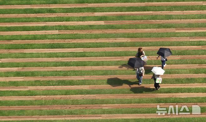 [서울=뉴시스] 박주성 기자 = 7월 초 이례적인 폭염으로 경기도 광명, 파주 등 일부 지역에서 낮 기온이 40도를 넘어선 가운데 9일 서울시청 광장에 시민들이 양산을 쓰고 이동하고 있다. 2025.07.09. park7691@newsis.com