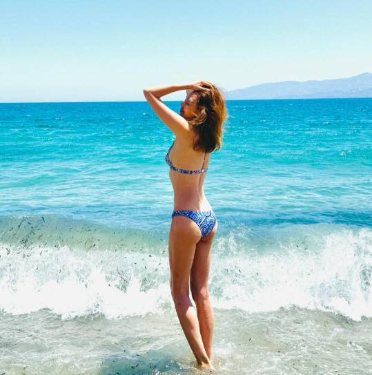 그리스 바다색과 어울리는 진한 파란색 비키니를 입은 야노 시호는 49세라는 나이가 믿기지 않을 만큼 군살 제로 완벽 몸매를 과시해 팬들의 부러움을 자아냈다.