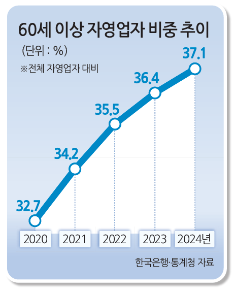 한국은행의 ‘늘어나는 고령 자영업자, 이유와 대응 방안’ 보고서에 따르면, 60세 이상 고령 자영업자 수는 2015년 142만명에서 2024년 210만명까지 급증하면서 전체 자영업자 가운데 고령층의 비중이 지난해 기준 37.1%로 커졌다.