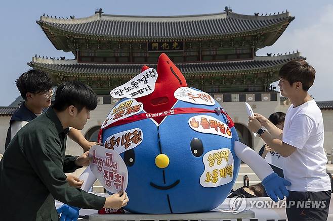 (서울=연합뉴스) 윤동진 기자 = 9일 서울 광화문 앞에서 열린 '민주노총 총파업지지 청년·학생 기자회견'에서 민주노총 등 참석자들이 관련 퍼포먼스를 하고 있다. 2025.7.9