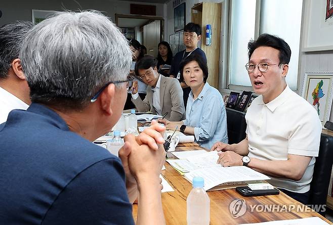 (대전=연합뉴스) 배재만 기자 = 김민석 국무총리가 9일 대전시 동구 쪽방 상담소를 방문, 쪽방촌 현황과 여름철 폭염 대비와 관련한 얘기를 나누고 있다. 2025.7.9