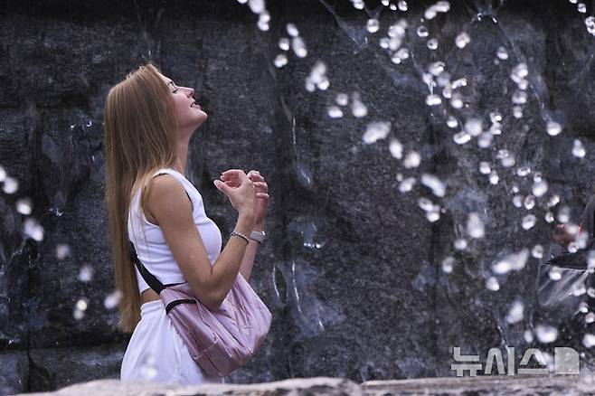 [모스크바=AP/뉴시스] 8일(현지 시간) 러시아 모스크바의 분수대에서 한 여성이 더위를 식히고 있다. 2025.07.09.